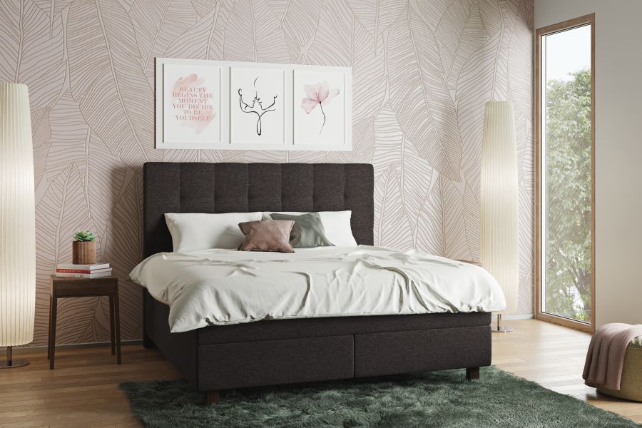 LIT en tissu Face Anthracite BOX fix, 25 cm PIED bois carré noyer, 10 cm HAUTEUR TÊTE DE LIT 133 cm MATELAS Lago, 19 cm (en deux parties) SURMATELAS Lino, 10 cm (en une partie)