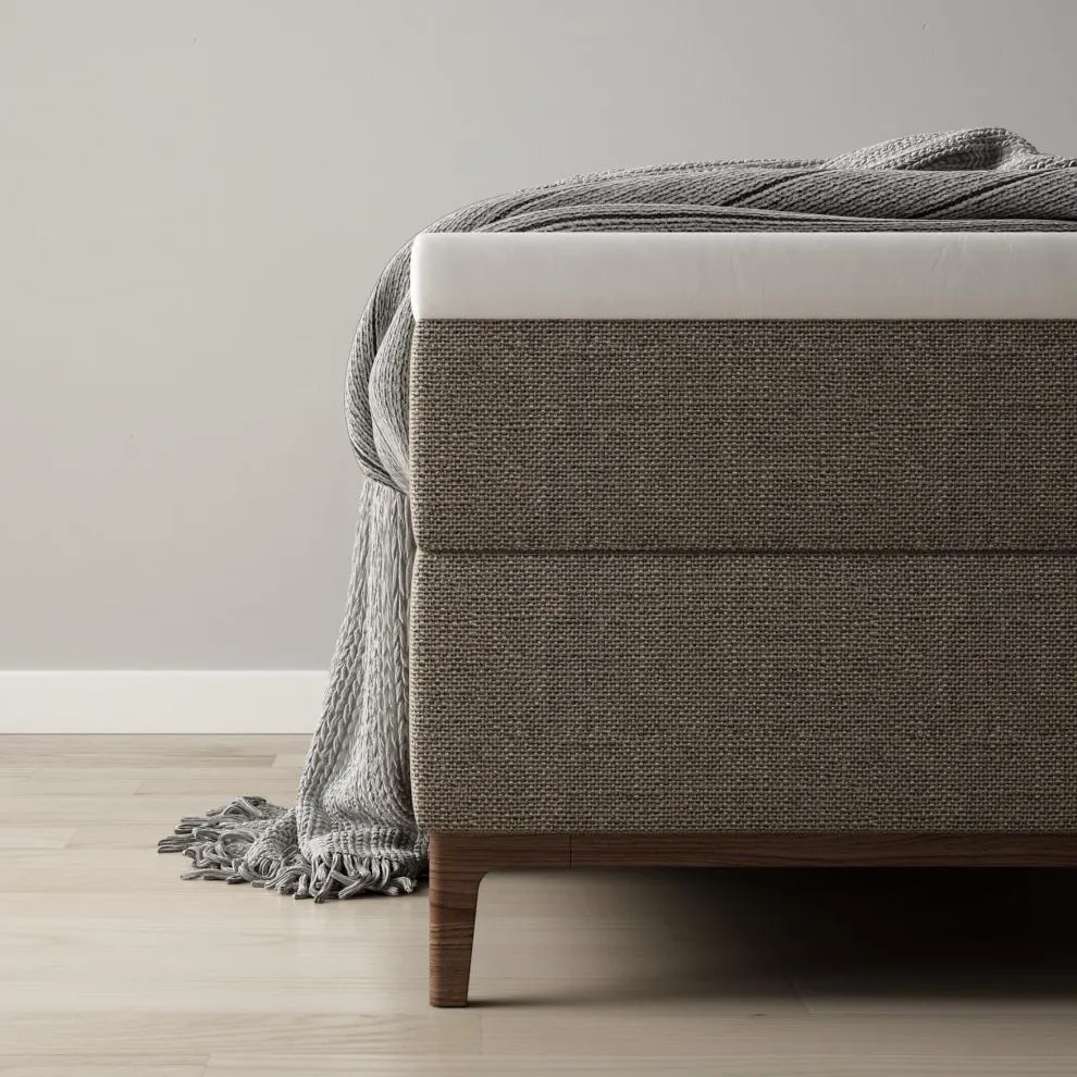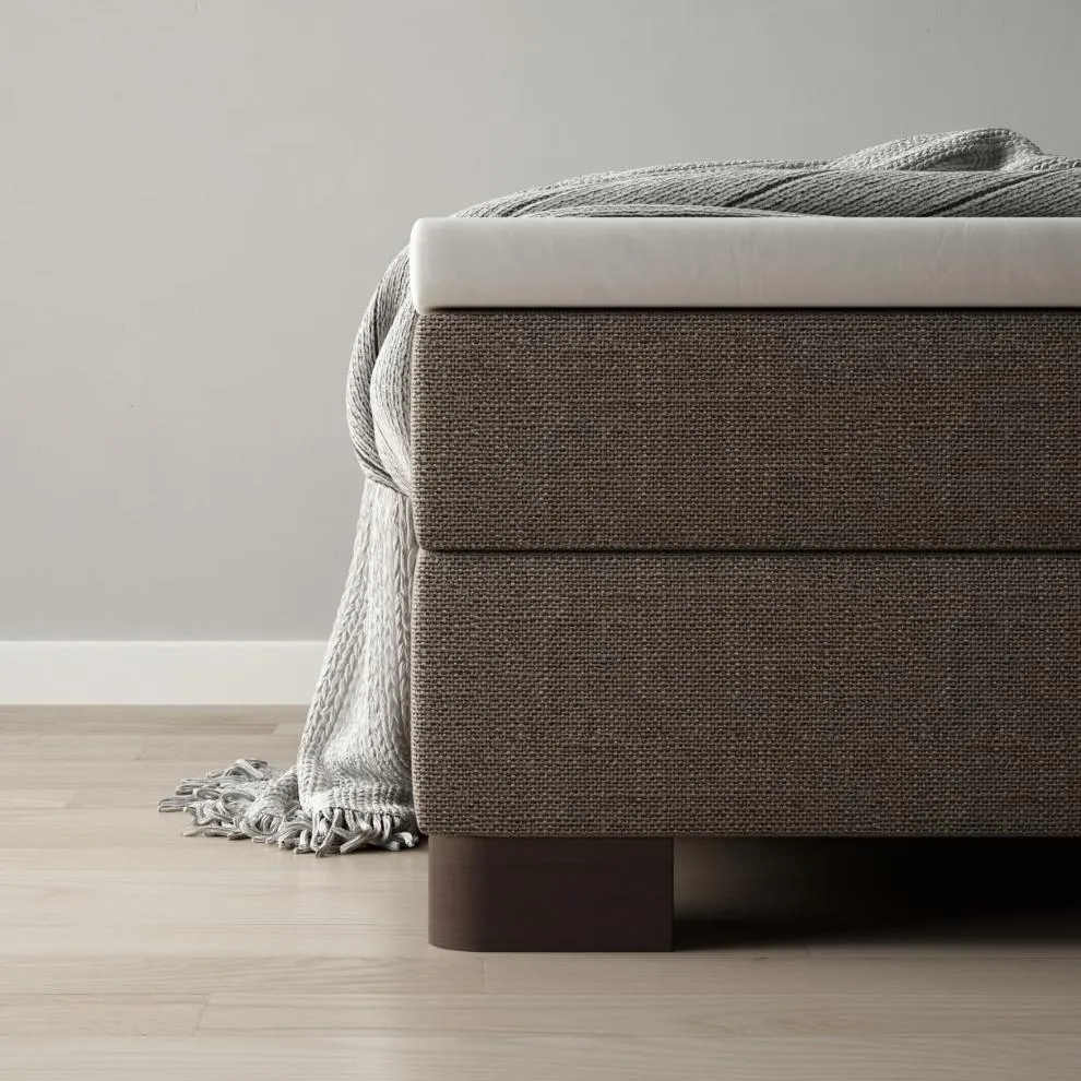 tissu de base: Velvet Sand BOX fix, 16 cm PIED conique 15 cm / coloris: noyer HAUTEUR TÊTE DE LIT 113 cm MATELAS Super Luxe, 22 cm (en deux parties) TABLETTE DE CHEVET noyer